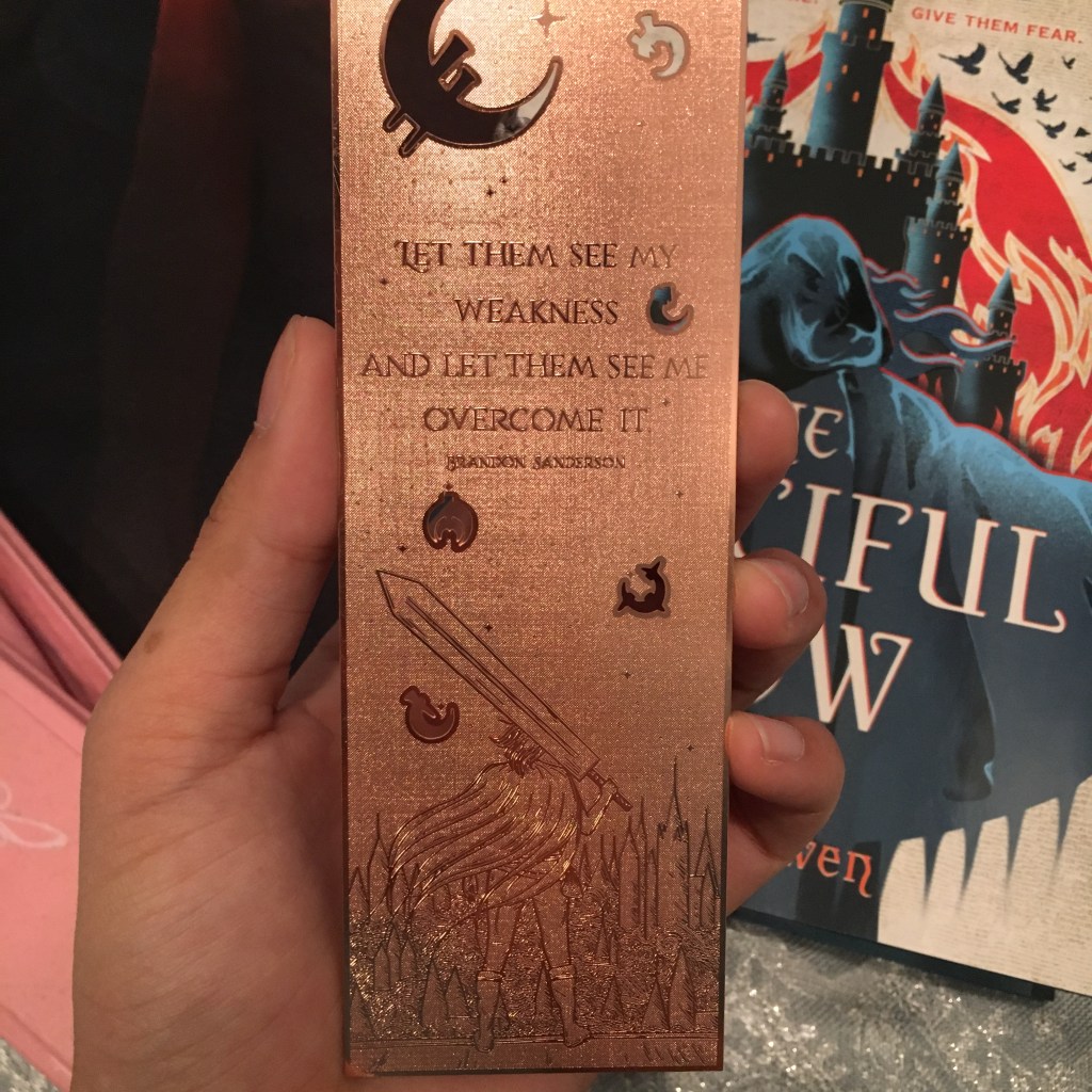 The Mistborn metal bookmark. Now I have not read Brandon Sanderson yet, I know criminal, but I have heard good things about his writing. What gets me is not only the color of this bookmark (I love it), but the fact that it is metal. It is def going to become one of my most used book marks in the future. It says: Let them see my weakness and let them see me overcome it.