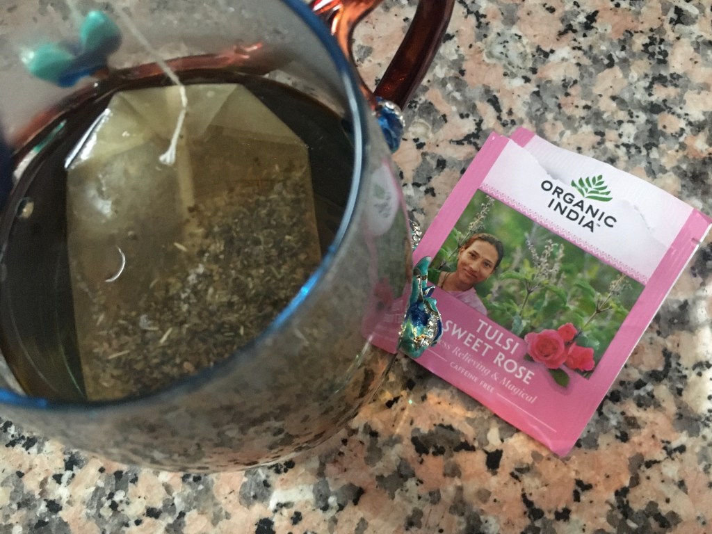 This tea is made from Organic Krishna Tulsi, Organic Rama Tulsi, Organic Vana Tulsi, Organic Chamomile, Organic Rose, Organic Lemon Myrtle, and Organic Stevia Leaf.