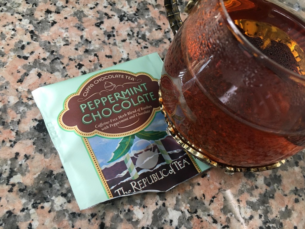 This tea is made from rooibos, carob, cocoa kernels, peppermint leaves, sweet blackberry leaves, natural mint flavoring, natural chocolate flavoring, and natural vanilla flavoring.