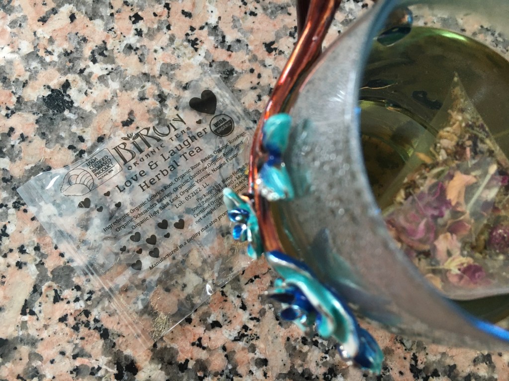 This tea is made from licorice root, rosehips, rose buds & petals, schisandra berries, oatstraw, stevia leaf, yarrow flower, holy basil leaf, anise seed, and natural flavor (all organic)