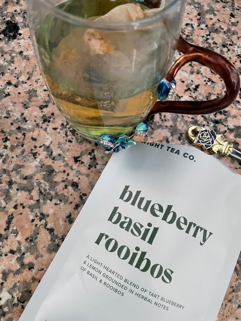This smells so good! the blueberries are so powerful. The taste is a bit bitter, which I think is that combination of rooibos, basil, and blueberries. The aftertaste, tho, is straight blueberry heaven. If you like fruity teas this is def for you. It’s not much for me, because I can’t get over that initial taste, but it is not terrible.