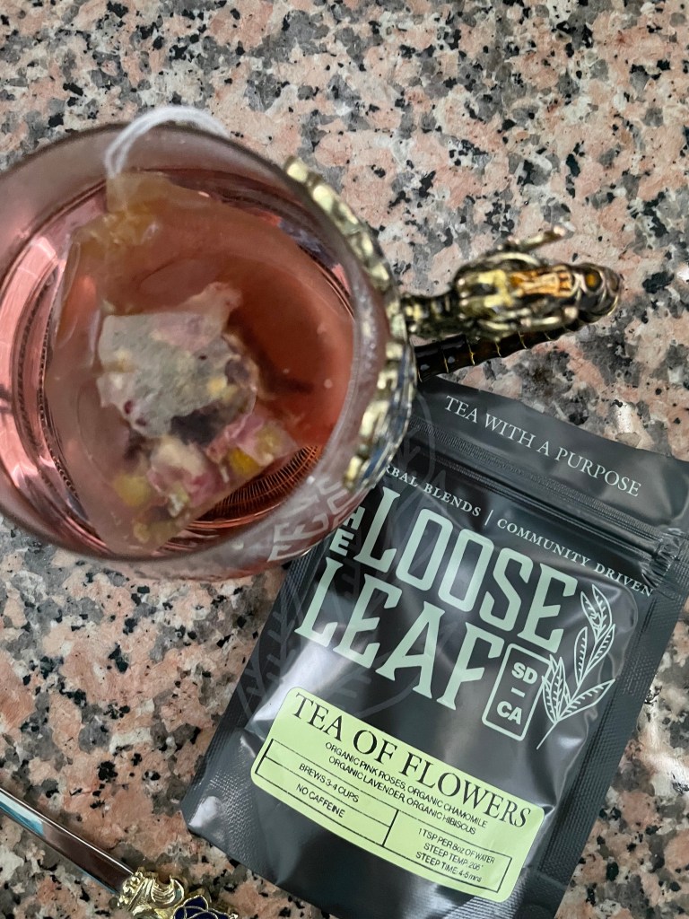 This tea color is so pretty and the bag is filled with dried flowers. That was the first indication to me that this box was going to be a good one. This tea has a strange way about it. The smell is rose, but the taste itself is hibiscus and the aftertaste is that chamomile and lavender. I think it really showcases how flavors first hit the tongue in potency. Regardless I love it. It’s so good!